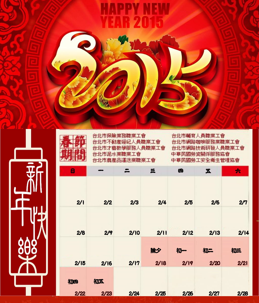 職業工會休假日期為 民國104年2月18日(星期三) 至 民國104年2月23日星期一)