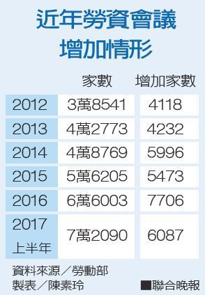 台灣因為工會組織率低,政府將很多事務交給勞資會議決定,導致勞資會議水漲船高,造就管理顧問公司商機。例如除了勞基法規定延長工時、實施變形工時、女性夜間工作等,後來連企業想聘僱外勞或上市上櫃,都必須符合定期舉行勞資會議規定,近年勞資會議增幅明顯,近五年增加一倍,尤其去年一例一休後政府宣示增加勞檢,今年光前兩季就增加6087件,遠遠超過以往一整年增幅。
